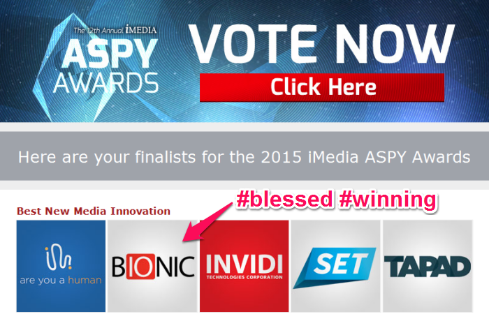 We had a nice surprise today. Bionic has been named a finalist for “Best New Media Innovation” for the 2015 iMedia ASPY Awards. Whoever nominated Bionic – Thank You! Whoever supported that and got Bionic to the finals – Thank You!