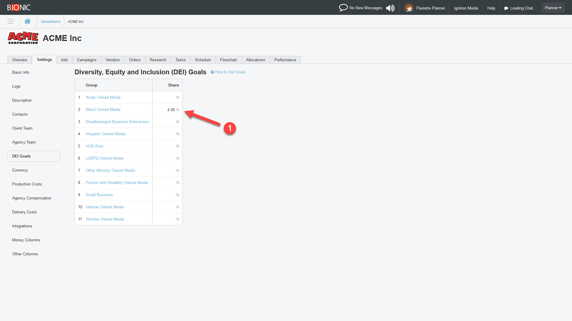 Once established, Bionic enables you to document the DEI goals for each advertiser through a new “Diversity, Equity and Inclusion (DEI) Goals” section of their settings. This sets the goals for the DEI Scorecards on each of this advertiser’s media plans.