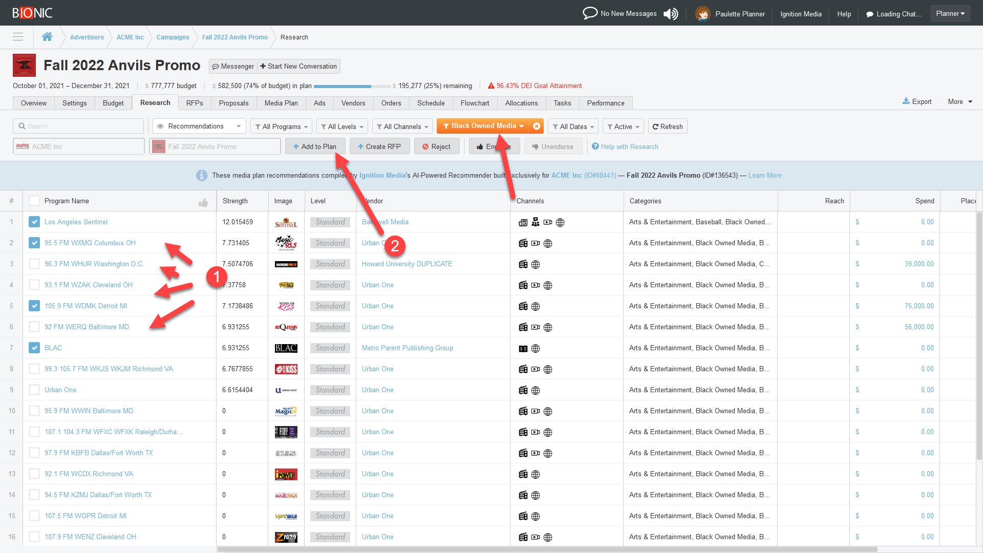 While viewing the DEI Scorecard, simply click the DEI category name to discover media suppliers that not only meet DEI objectives but also match media planning objectives. This is accomplished by combining DEI search criteria with Bionic’s AI-powered media recommender.