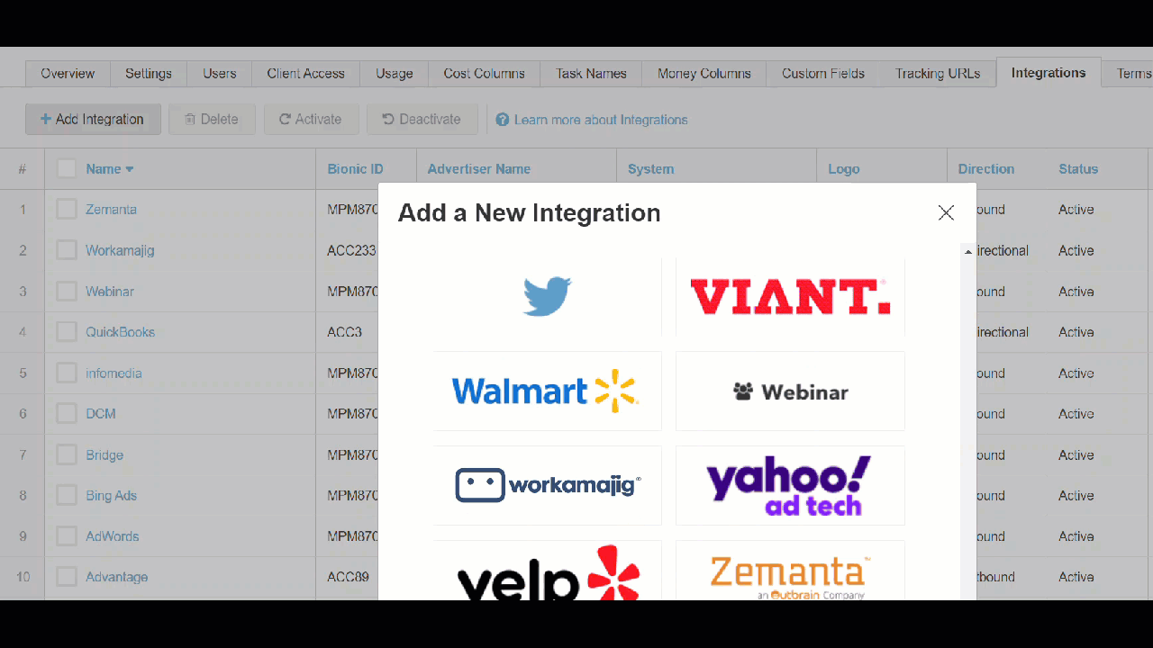 GIF showing how to add a new Workamajig Integration in Bionic.